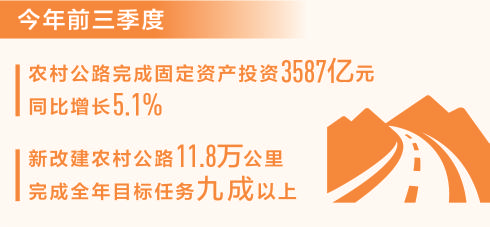 近日从交通运输部获悉:今年前三季度,我国农村公路完成固定资产投资3587亿元,同比增长5.1%;新改建农村公路11.8万公里,完成全年目标任务的九成以上;实施农村公路安全生命防护工程7.8万公里、改造农村公路危桥5409座,在全国7679个农村公路平交路口加装减速带1.5万个。