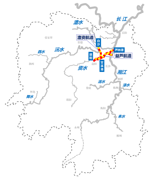 位于沅水、资水连接段,是湖区高等级航道成环成网的关键,总投资估算约16.3亿元,按1000吨级标准建设白沙至甘溪港36公里航道,航道尺度为2.4×60×340米。