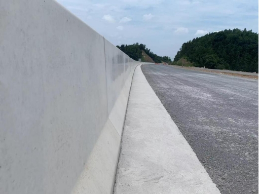 项目负责人介绍,护栏预制采用自动喷淋洒水养生系统,从供水到工作完毕,已经实现养生过程全自动控制,有效确保护栏的混凝土强度及外观光泽。值得一提的是,为保证路面成型后路面比路肩石高0.5厘米,项目部在路肩石安装时严格控制标高和线型,确保后续排水通畅,安装后线型顺直。