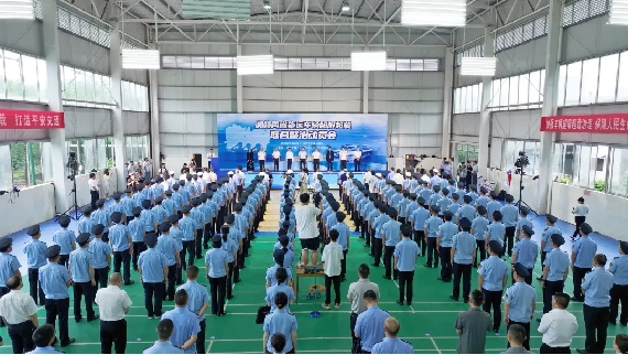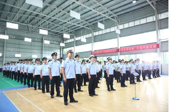 动员会现场,湖南、江西两省交通运输、公安交警等多部门的100名执法人员和10辆执法车辆组成整齐划一的方阵,信心满满,整装待发。执法现场摆放无人机、执法记录仪、执法终端等执法科技装备,蓄势待定。与会领导一同走上会场主席台,共同推杆宣布湘赣两省货运车辆超限超载联合整治正式启动。“出发!”随着号令声下,执法方阵依次出发,快速奔赴执法现场。