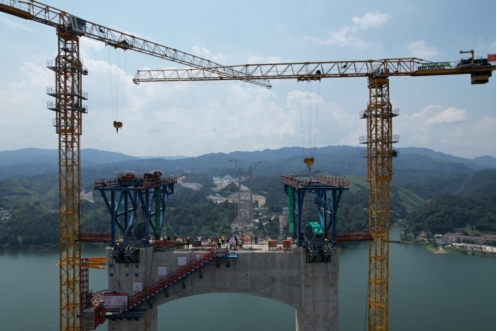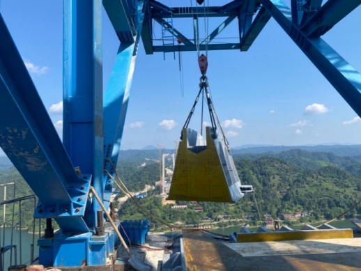 脚下,就是五溪湖山水画境,他们暂时无暇顾及,每一次吊装过程大约需要2个小时,他们要时刻紧盯吊装件的稳定性和角度控制,不能有丝毫松懈。