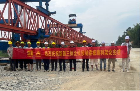 新新张官隆回分公司第三合同段项目全线预制梁板包括30m箱梁452片,20m箱梁600片,共计1052片。项目采用自动喷淋养生、智能张拉、智能压浆、智能钢筋加工设备等新设备新工艺进行施工,确保箱梁预制的质量、效率和安全性。在桥梁架设过程中,项目管理团队克服施工场地受限、梁板运输困难、高空施工作业等重重困难,如期完成所有梁板的预制、运输、架设等工作。
