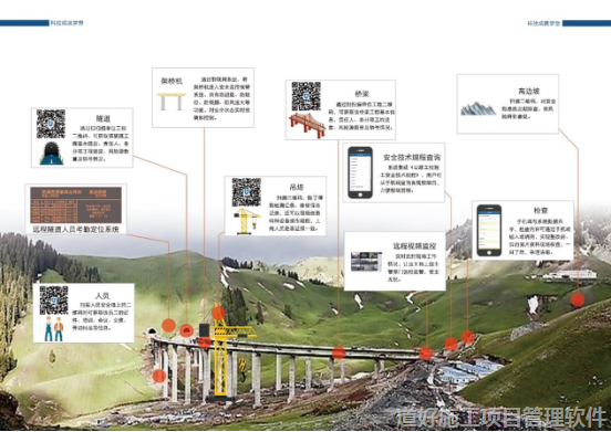 以下是公路施工系统应用现场管理示意图,通过移动互联网技术、物联网技术和二维码技术,结合现场监控等手段,充分展示了公路工程施工安全管理系统在施工现场的全方位应用。