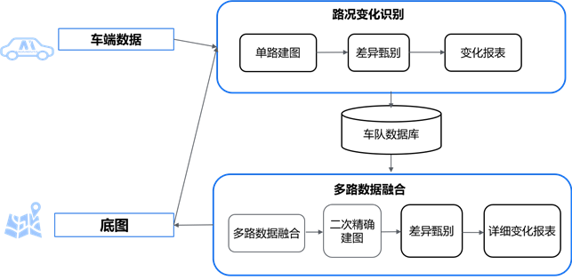 系统通过每台巡逻车上的传感器(Camera+IMU+GNSS)采集路况信息,然后由AI芯片解算道路碎片信息,通过4G将数据上传至云端服务器,服务器通过计算机视觉算法分析路况数据,对有变动的路况进行告警,迅速准确判断出道路设施损坏情况。